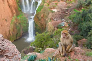 At the foot of the waterfalls, you can enjoy a refreshing swim, savor a meal with your feet in the water, or simply sip mint tea while watching the playful Rhesus macaques (desert monkeys).